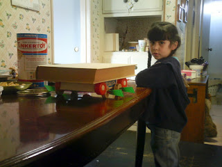 To learn about Wheels, I put a LARGE and HEAVY book on the table and had K. push it from one end of the table to the other. It was hard to do. Rolling it on something would make it easier. So we put markers under the book and pushed it along. This worked well, but we had to keep putting new markers under the book, so it was tiresome. The rollers needed to be attached to the book, or the book needed to be on something with wheels. K. went and got her little plastic wagon, but the book was too heavy and the wheels didn't turn, so we got the Tinkertoys out and made wheels, set the wagon on the wheels and the book on the wagon. It worked!